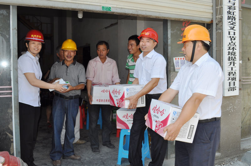 連日高溫酷暑,給在炎炎烈日下作業(yè)的工地工人和管理人員造成嚴(yán)重的困擾,對(duì)各在建項(xiàng)目的安全生產(chǎn)形勢(shì)帶來(lái)嚴(yán)竣挑戰(zhàn)。公司除及時(shí)通知各項(xiàng)目部落實(shí)高溫作業(yè)時(shí)間和防暑降溫措施外,在7月31日由總經(jīng)理助理方小仙、工程部經(jīng)理張金海帶領(lǐng)工程部管理人員對(duì)市區(qū)所有在建項(xiàng)目進(jìn)行高溫慰問(wèn)。