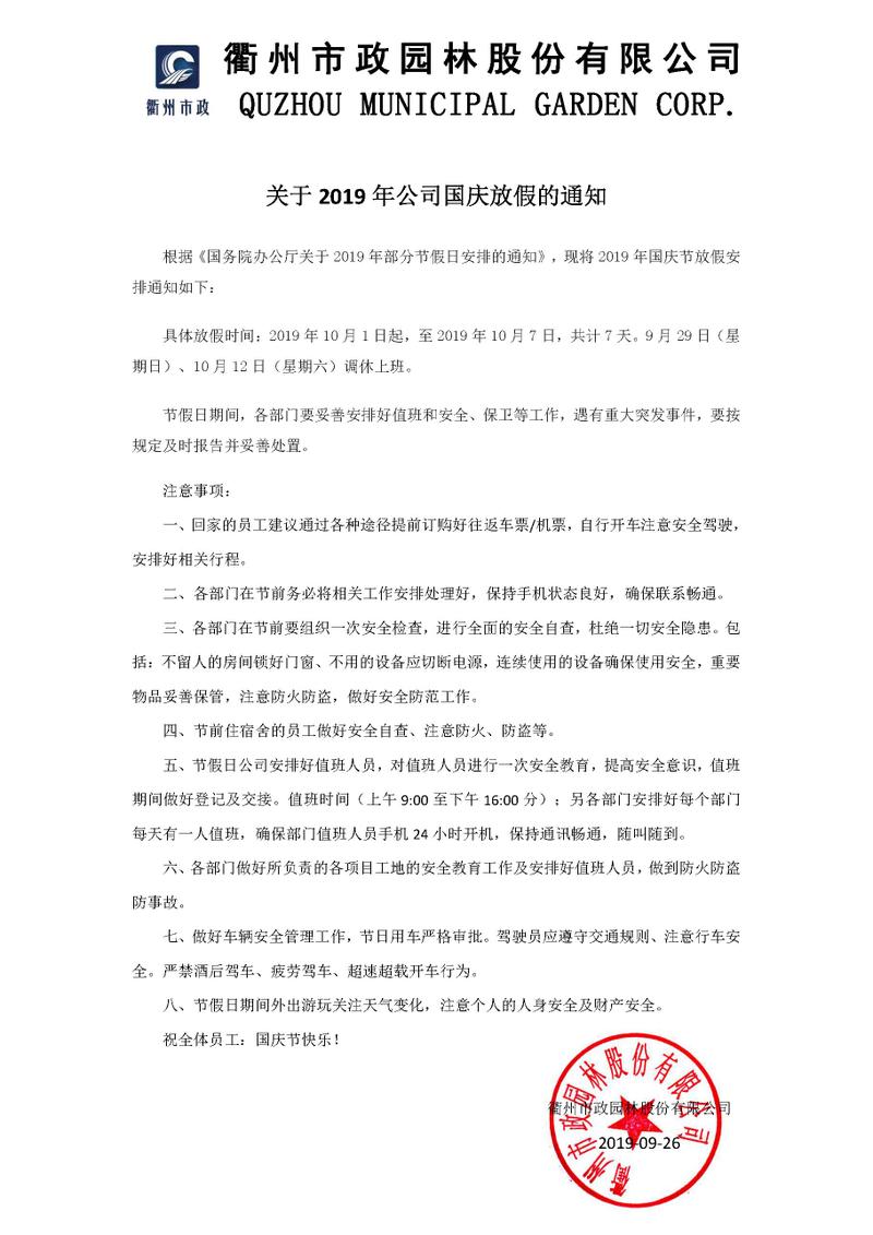 關(guān)于2019年公司國慶放假的通知